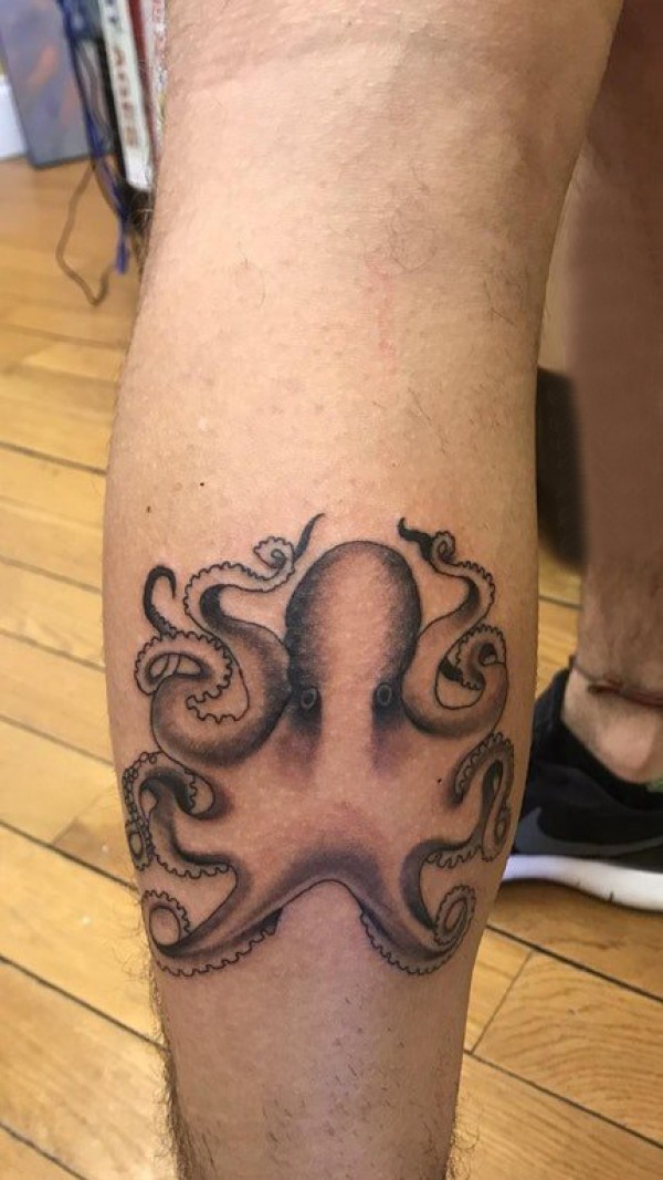 黑色章鱼纹身 男生小腿上活泼的章鱼纹身图片