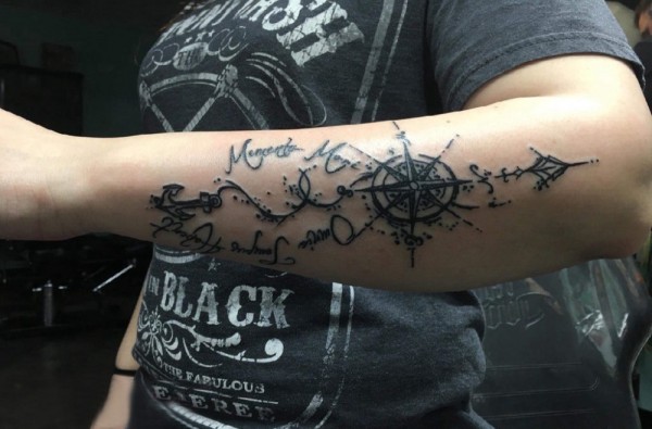 纹身手臂女生 女生手臂上英文和指南针纹身图片