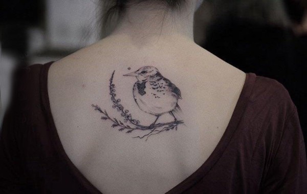 纹身鸟 女生后背上鸟和植物纹身图片