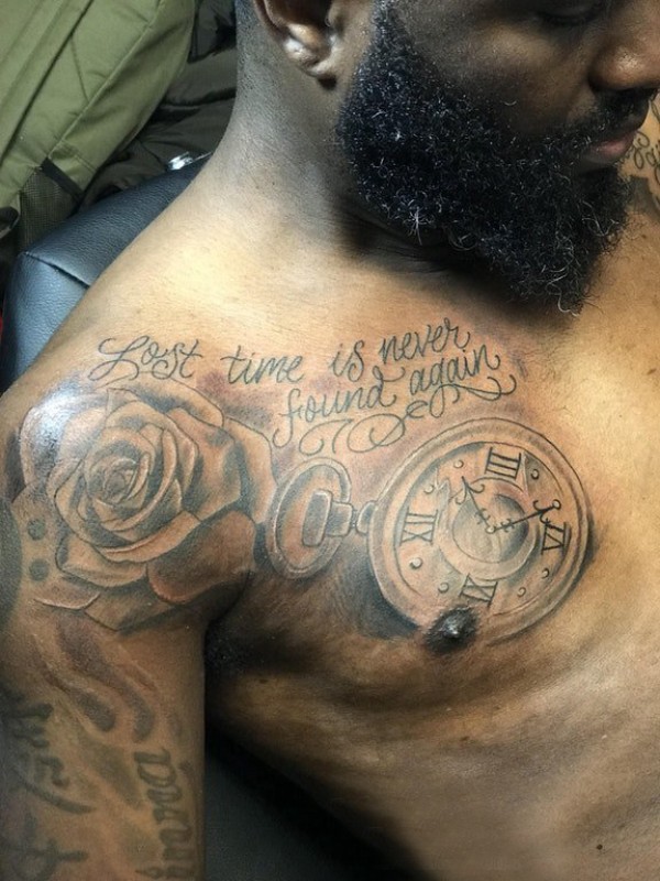 纹身肩膀男 男生肩膀上玫瑰和钟表纹身图片