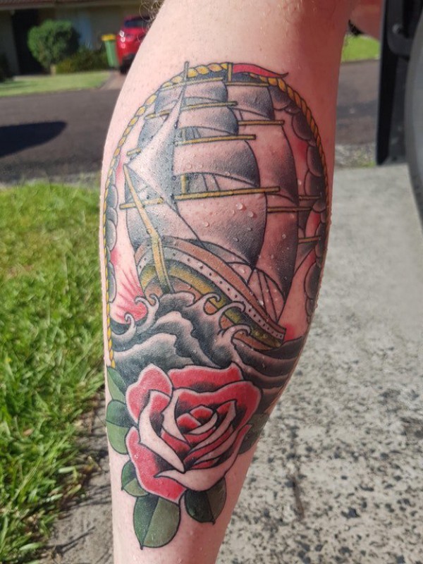 纹身小帆船 男生小腿上帆船和花朵纹身图片