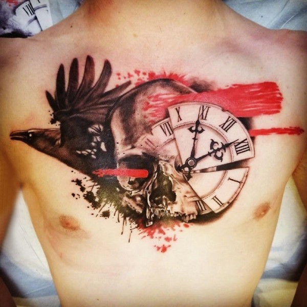纹身胸部男 男生胸部乌鸦和时钟纹身图片