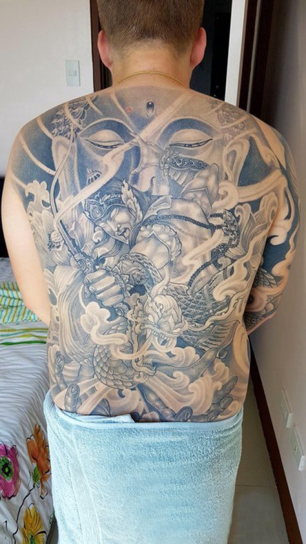 弥勒佛纹身图案 男生后背上佛和龙纹身图片