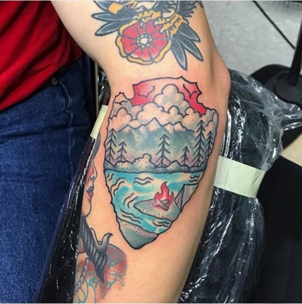 手臂纹身图片 男生手臂上彩色的山水纹身图片