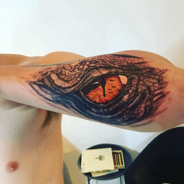 眼睛纹身 男生手臂上彩色的鳄鱼眼睛纹身图片