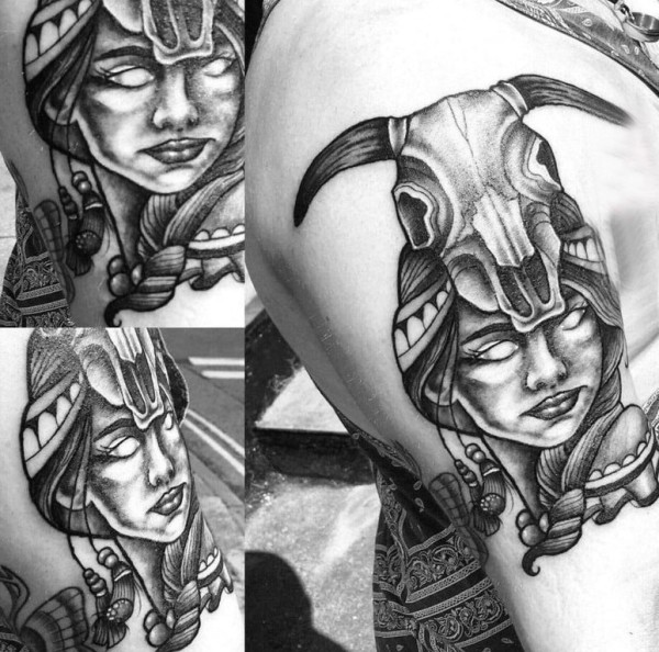 羊头骨纹身 男生大臂上人物和羊头骨纹身图片