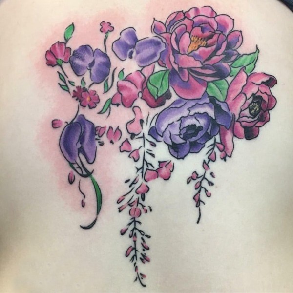 小清新植物纹身 女生后背上彩色的植物纹身图片