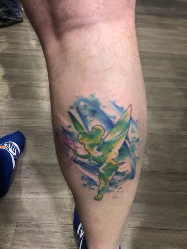 小精灵纹身勾线 男生小腿上彩色的精灵纹身图片