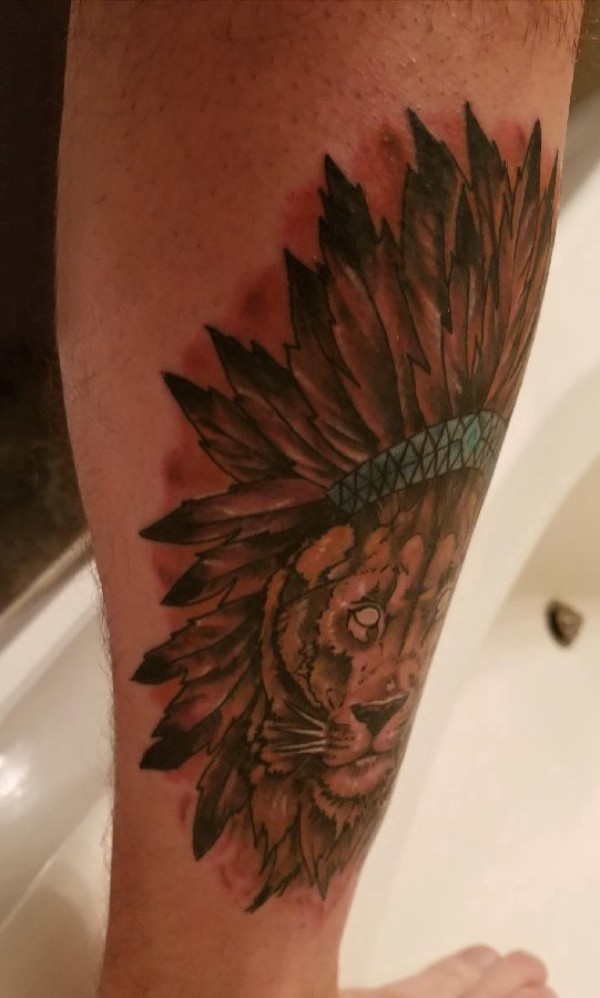 印第安羽毛纹身 男生小腿上彩色的印第安风狮子纹身图片