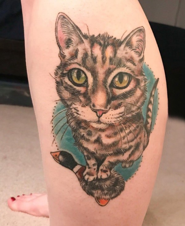 小猫咪纹身 女生小腿上彩绘的猫咪纹身图片