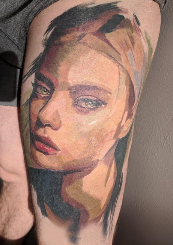 油画风格纹身 男生大腿上彩色的油画风格纹身图片