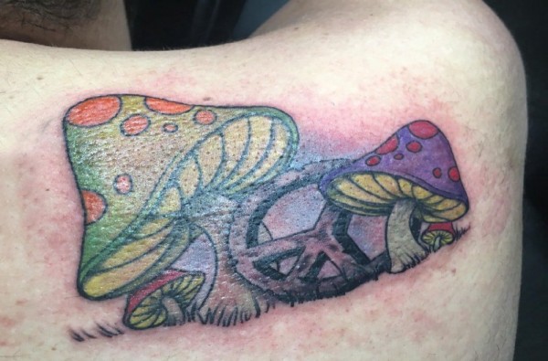 植物纹身 男生后背上彩色的蘑菇纹身图片
