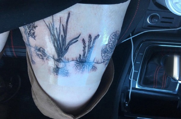 植物纹身 女生大腿上黑灰的植物纹身图片