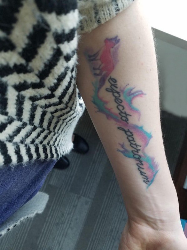 彩色渐变纹身 女生手臂上英文和狐狸纹身图片