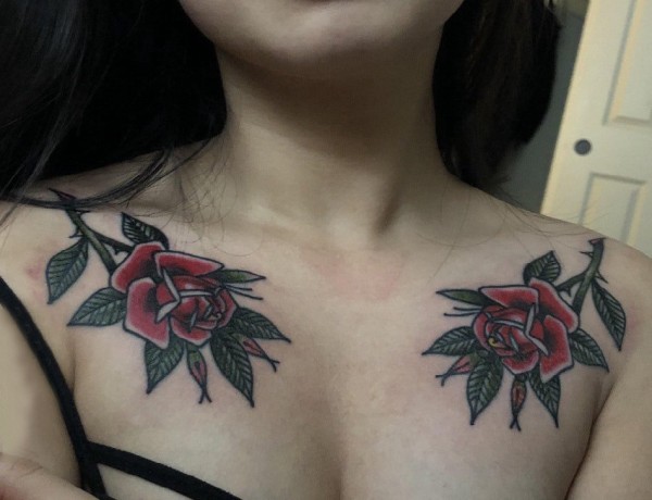 女生纹身锁骨 女生锁骨上彩绘的花朵纹身图片