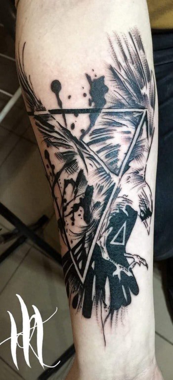 纹身黑色 男生手臂上三角形和鸟纹身图片