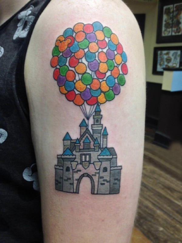 双大臂纹身 男生大臂上气球和城堡纹身图片