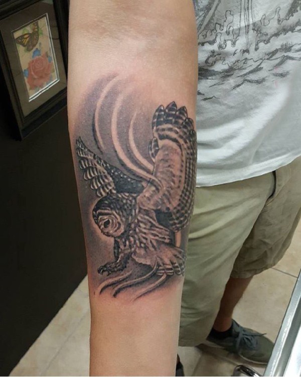 猫头鹰纹身图 男生手臂上灰色的猫头鹰纹身图片