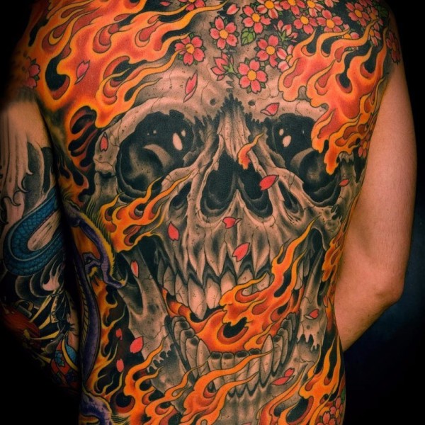 满背纹身图案 男生后背上火焰和骷髅纹身图片