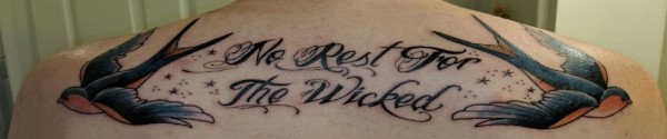 后背纹身男 男生后背上燕子和英文纹身图片