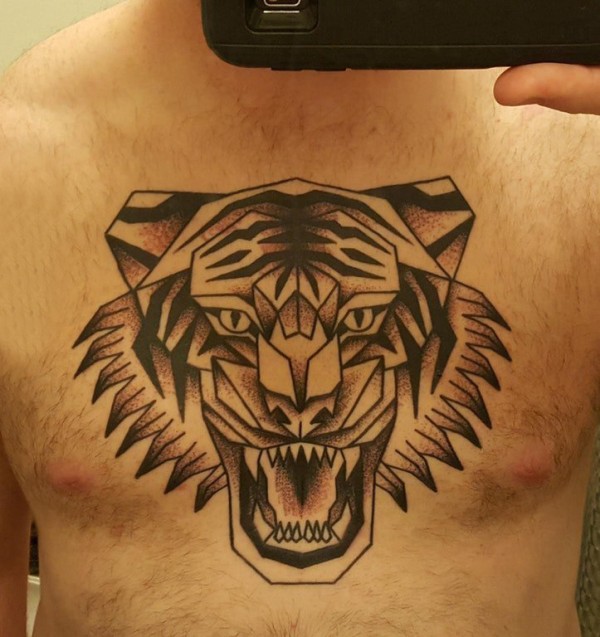 纹身胸部男 男生胸部黑色的老虎纹身图片
