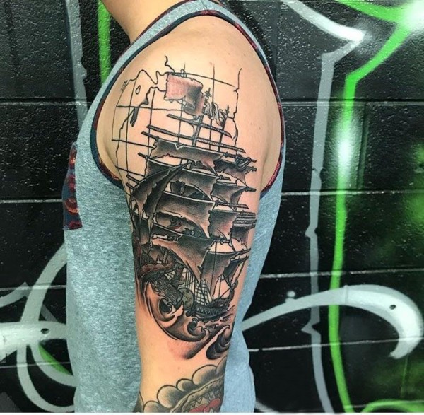 纹身小帆船 男生手臂上地图和帆船纹身图片