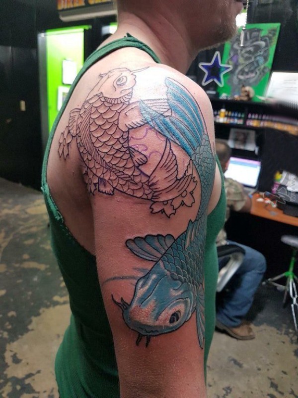 小动物纹身 男生手臂上彩色的鲤鱼纹身图片