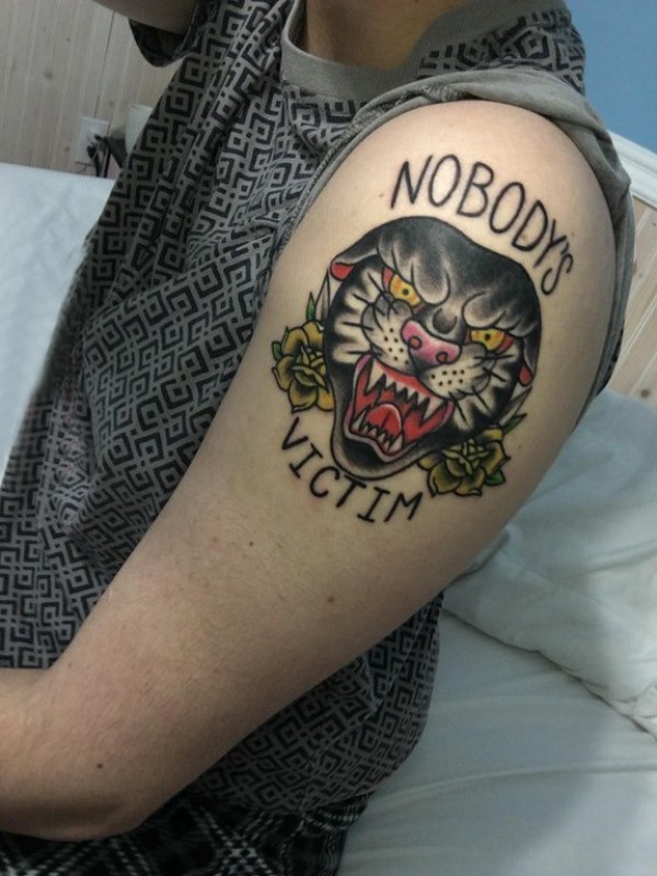 豹子头纹身 男生大臂上彩绘的豹子头纹身图片