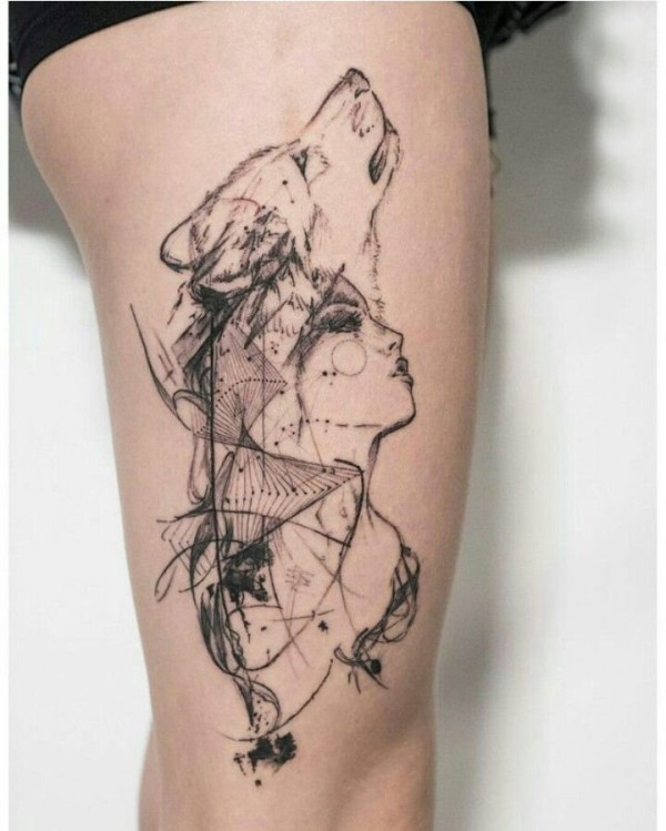 大腿纹身传统 女生大腿上狼头和人物纹身图片