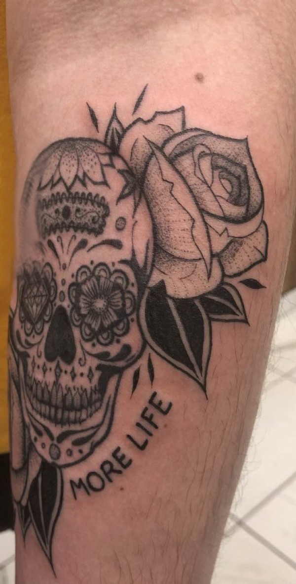 骷髅和花朵纹身图案 男生小腿上骷髅和花朵纹身图片