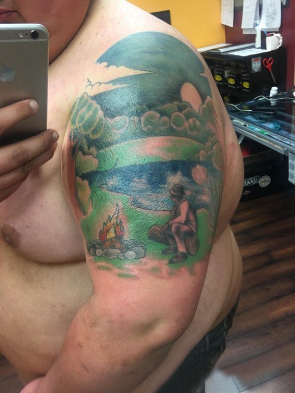 双大臂纹身 男生大臂上彩绘的风景纹身图片