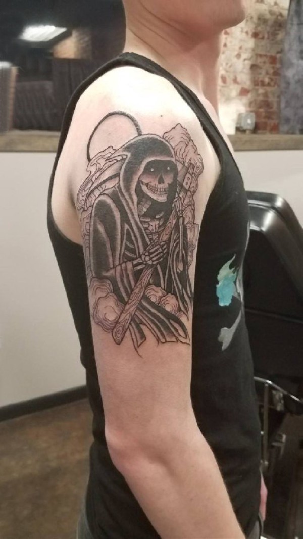 死神纹身 男生大臂上黑色的骷髅死神纹身图片