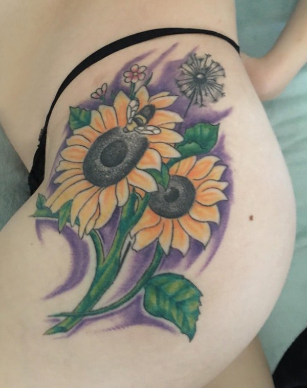 臀部纹身 女生臀部彩色的向日葵纹身图片