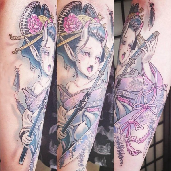 手臂纹身素材 男生手臂上剑和艺妓纹身图片