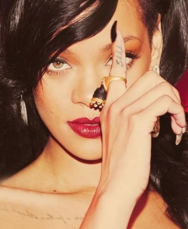 美国纹身明星 蕾哈娜手指上黑色的英文纹身图片