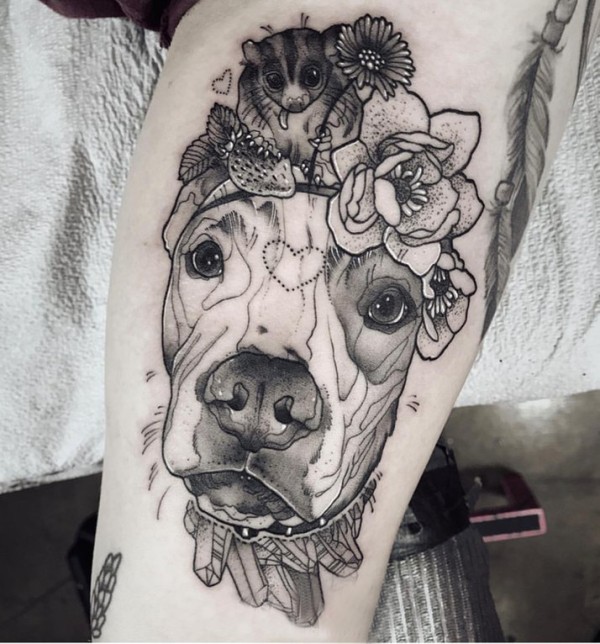 欧美小腿纹身 男生小腿上植物和小狗纹身图片