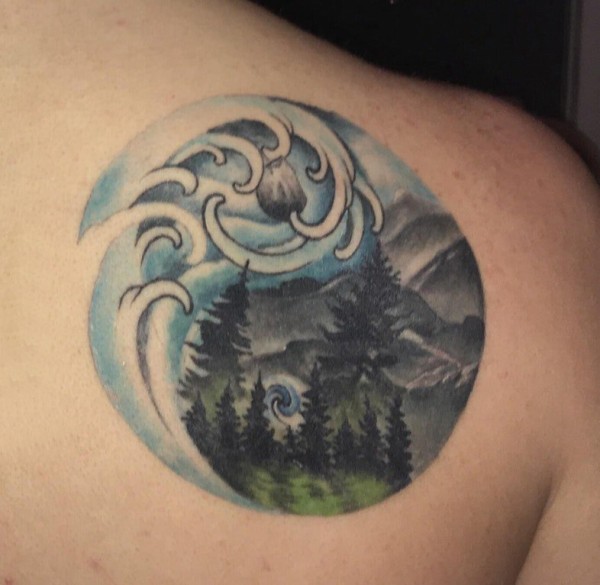 纹身风景 男生后背上彩色的山脉风景纹身图片