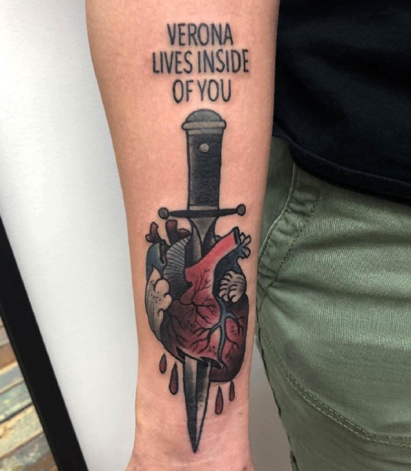 心脏纹身图案 男生手臂上心脏和匕首纹身图片