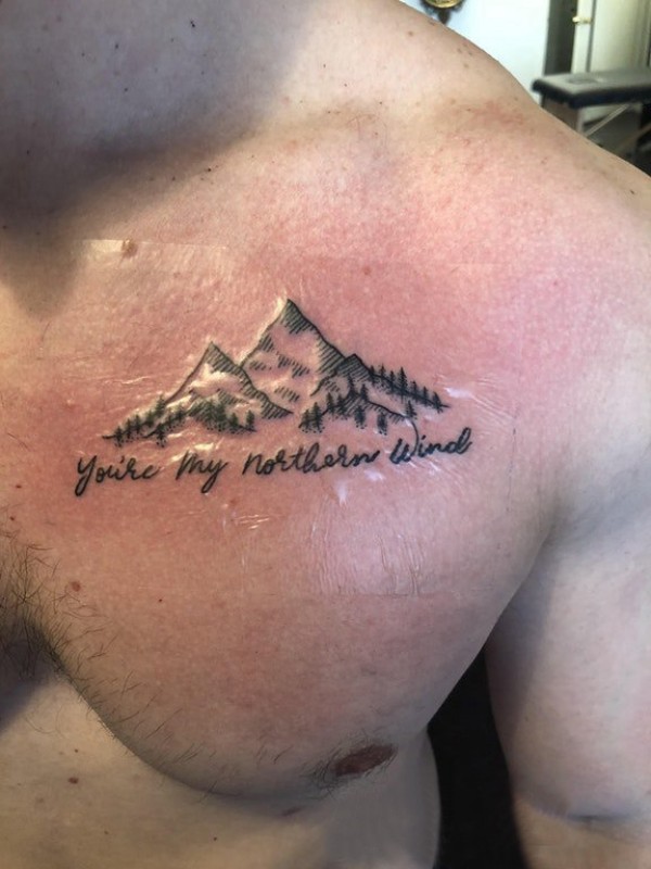 小山峰纹身 男生胸上山峰和英文纹身图片