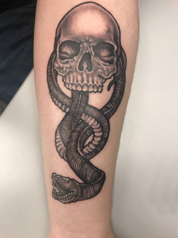 纹身黑色 男生手臂上蛇和骷髅纹身图片