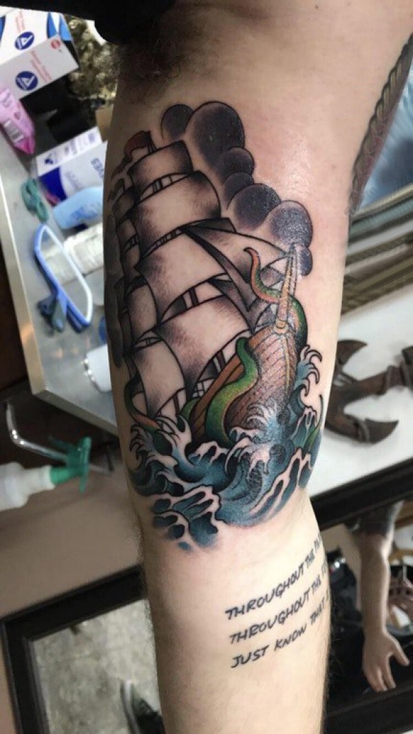 小帆船纹身 男生手臂上彩绘的小帆船纹身图片