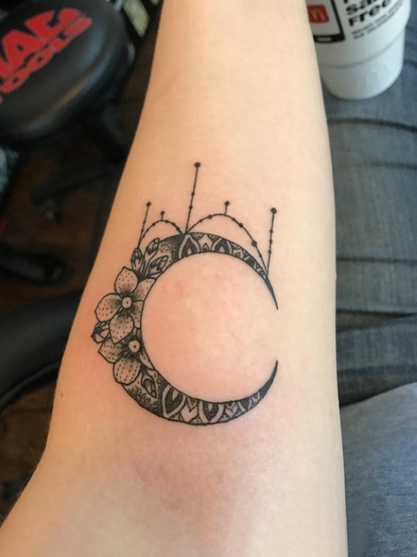 纹身月亮女生图片 女生手臂上花朵和月亮纹身图片