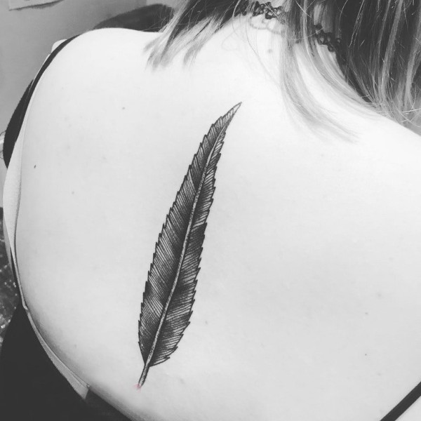 女生后背纹身图 女生后背上黑色的羽毛纹身图片