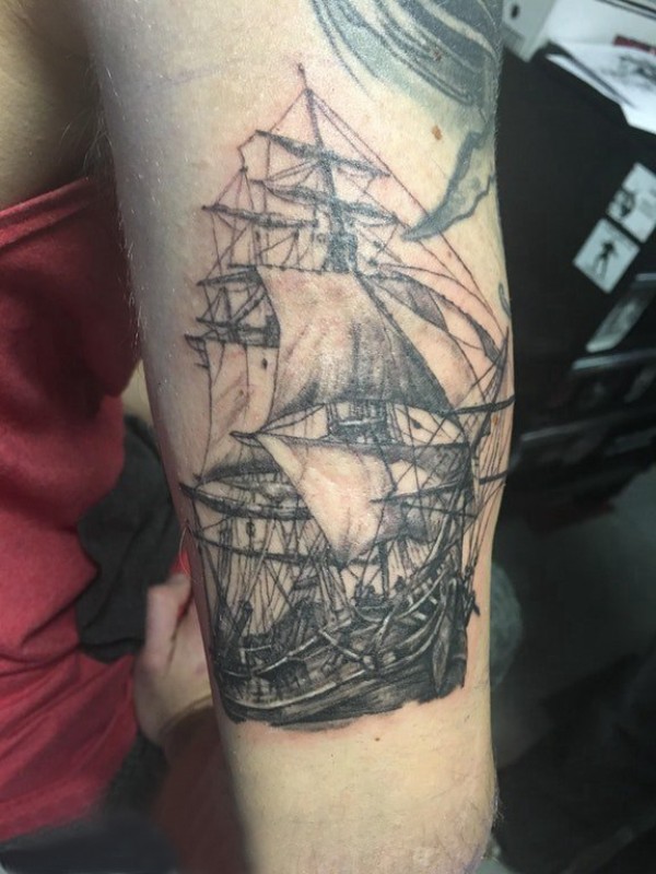 纹身小帆船 男生大臂上黑色的帆船纹身图片