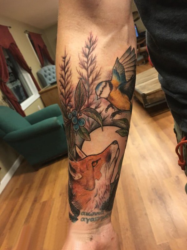 小动物纹身 男生手臂上小鸟和狐狸纹身图片