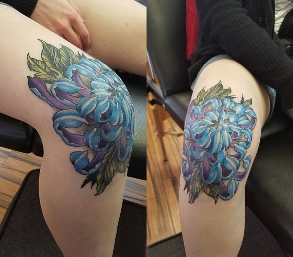 膝盖纹身图案 女生膝盖上彩色的牡丹纹身图片