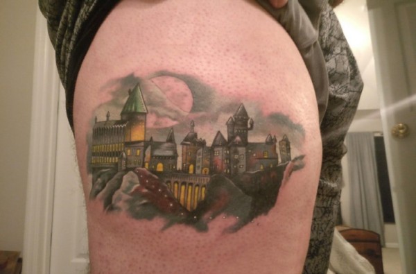 大腿纹身男 男生大腿上彩色的城市建筑物纹身图片