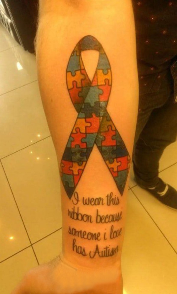 欧美拼图纹身 男生手臂上英文和丝带纹身图片