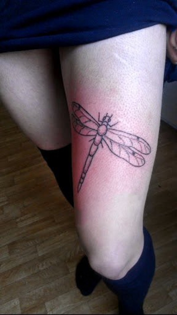 蜻蜓纹身图案 女生大腿上黑色的极简纹身图片