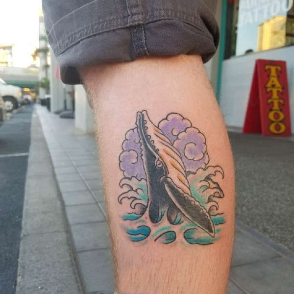 纹身鲸鱼 男生小腿上鲸鱼和浪花纹身图片